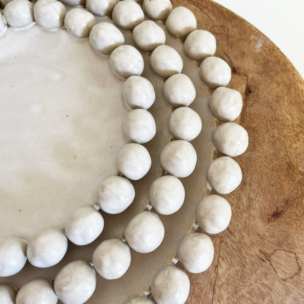Round plates with a dramatic beaded edge. Only the largest three sizes are available.